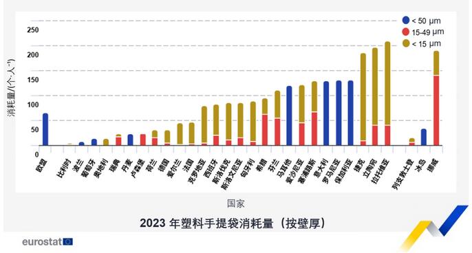 2023年,欧盟人均消费65个轻型塑料购物袋,较上年(67个)仅减少3.0%。与2018年的人均95个相比,轻型塑料购物袋消费量逐年下降,反映出欧盟各国实施的减耗措施正在发挥作用。