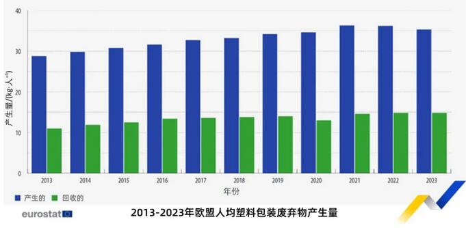 2023年,欧盟对所产生的塑料包装废弃物回收率为42.1%,高于2013年的38.2%。