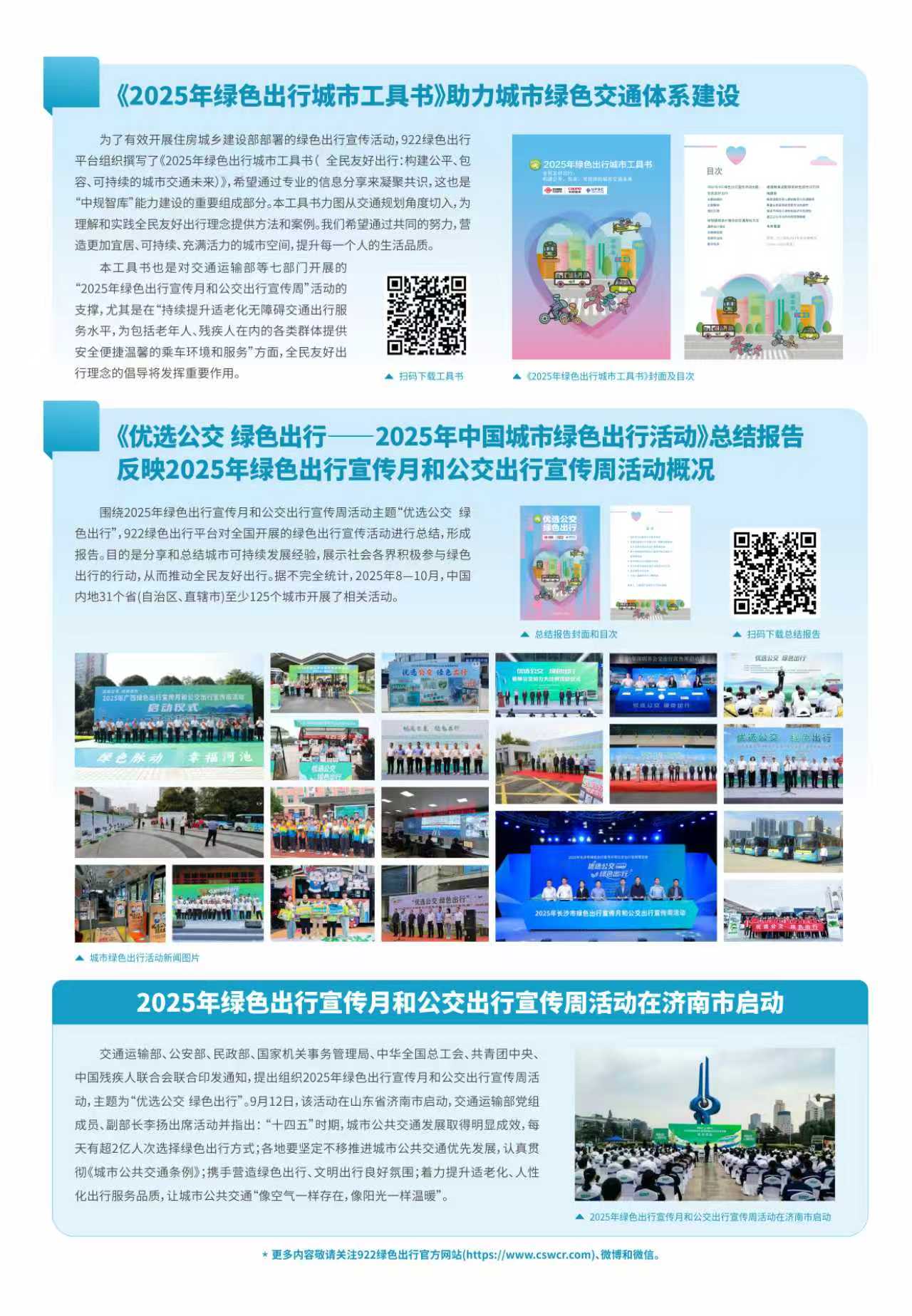 在中国城市规划设计研究院与中国城市规划学会的长期支持下,922绿色出行平台已连续19年对全国性绿色出行活动进行系统总结,构建了以“两书一会+两微一网”为核心的常态化科普宣传体系。活动前期,组织撰写了《2025年绿色出行城市工具书( 全民友好出行:构建公平、包容、可持续的城市交通未来)》。活动结束后,围绕2025年绿色出行宣传月和公交出行宣传周活动主题,撰写《优选公交 绿色出行——2025年中国城市绿色出行活动》总结报告,目的是分享和总结城市可持续发展经验,展示社会各界积极参与绿色出行的行动,从而推动全民友好出行。