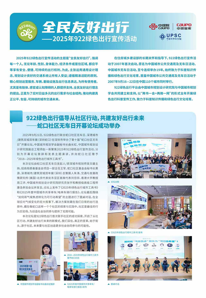 2025年9月21日,922绿色出行联合蛇口社区无车日、深港城市/建筑双城双年展(深圳蛇口)在深圳市举办了第十届“蛇口社区无车日”开幕论坛。中国城市规划学会副秘书长曲长虹、中国城市规划设计研究院副总工程师赵一新聚焦2025年922绿色出行宣传活动,分别为开幕论坛致辞和发表主题演讲,并向蛇口社区赠予“2018—2025年绿色出行城市工具书”。 论坛上发布了《2025年绿色出行城市工具书》和《2025年度中国城市共享单车/电单车骑行报告》。本次论坛是922绿色出行首次联手社区的成功探索,开启了从社区行动、共建友好出行未来的新模式。