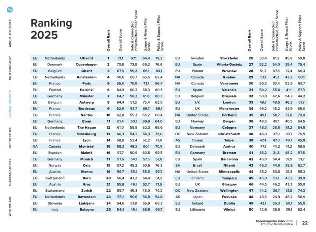 跻身前30名不仅意味着基础设施数量达标,更表明政策愿景、设计质量与日常使用三者高度一致。这些城市已将骑行常态化,使其成为全年可用的实用出行方式,而非仅作为出行备选项,更是一种社会常态。
