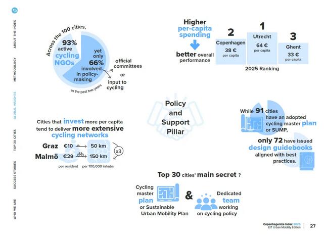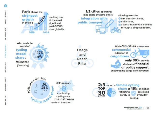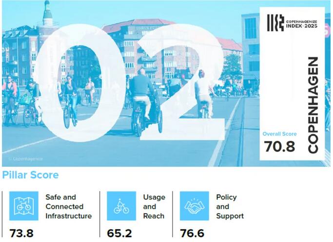 哥本哈根指数(EIT城市出行版)——由欧盟机构欧洲创新与技术研究院(EIT,European Institute of Innovation and Technology)发起的一项倡议,汇集了来自全球骑行领域的最新数据与案例。自 2011 年起发布,该指数提供基于证据的基准,用于追踪全球各城市在使骑行安全、便捷和普及方面的发展程度。该指数突出示范城市、支持知识共享,并为城市规划人员、倡导者和决策者提供透明框架。