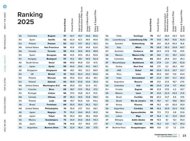 值得关注的新秀城市:魁北克市、里昂、伯尔尼、格拉茨、博洛尼亚、斯德哥尔摩、维多利亚-加斯泰斯和弗罗茨瓦夫首次进入该指数,显示出向骑行转型的强劲势头。