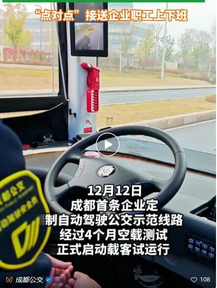 12月12日,成都首条企业定制自动驾驶公交示范线路,经过4个月空载测试正式启动载客试运行。该线路作为成都市首例自动公交示范应用,立足成都“立园满园”行动,聚焦衔接产业园区与通勤枢纽,实现“地铁+自动驾驶公交”无缝换乘,畅通高效智慧通勤。自动驾驶公交首批2条定制专线率先在成都未来科技城开行,起点为福田TOD站,全程无中途停靠,直达阿里云、必控科技等产业园区,根据企业员工通勤时间定时开行,为园区上班族提供点对点的定制服务,实现通勤无缝接驳,让上班路更便捷、更智慧。(摘编自成都公交微信公众号,网址https://mp.weixin.qq.com/s/ZD4uhpsJkW6DIllW5k9PlQ,下载日期2025-12-13)