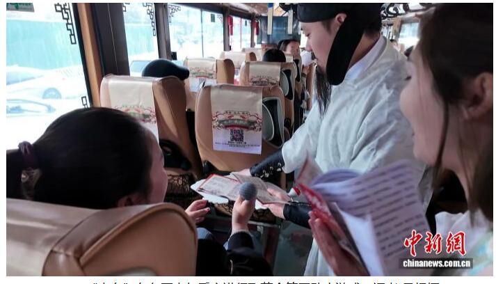 今年春节期间,成都公交集团推出的“诗词之路”观光专线吸引了不少游客前来体验。这辆特殊的公交车,不仅司机装扮成古代诗人模样,车厢也化身为移动的诗词长廊,目之所及,皆是与成都相关的千古名句。寻常的公交出行,变为一场跨越时空的诗意对话。