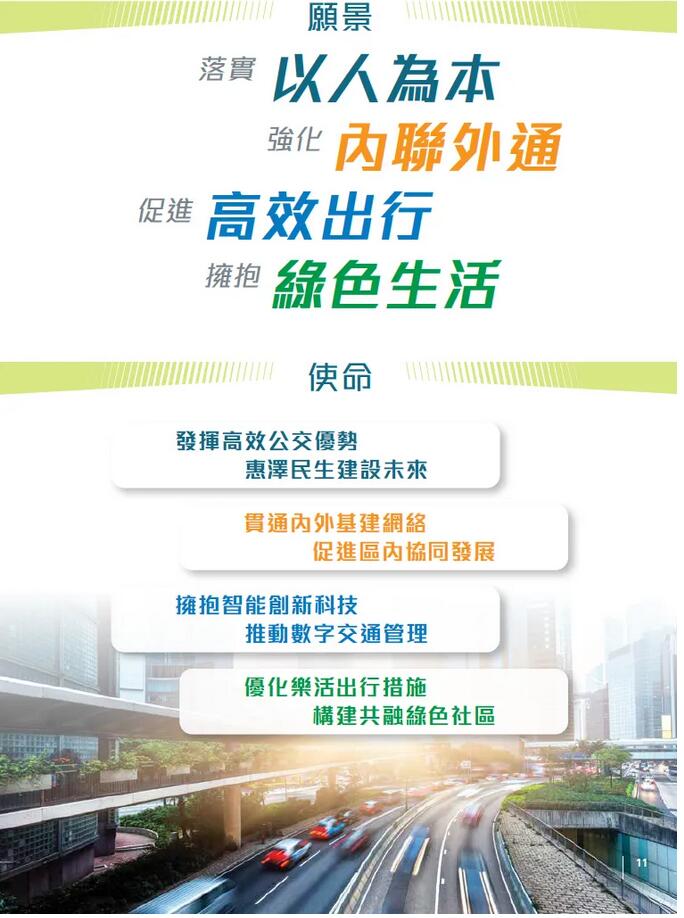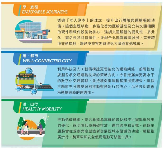 3个主题分别为“享・旅程”、“连・都市”和“活・出行”。“享・旅程”秉持以公共交通为本的运输政策,强化本地和跨境运输基建,连通港九新界各个经济核心区域,带动经济发展并优化乘客出行体验。 “连・都市”着重利用先进科技推动数字化交通管理,以提高运输效率,包括让部分公共交通服务按乘客个人需要更灵活调度、推广自动驾驶,以及与公众分享更多交通运输数据以便规划行程,推动智慧出行。 “活・出行”则会将可持续社区的概念融入城市规划,积极推广步行、单车和电动可移动工具等绿色出行方式。