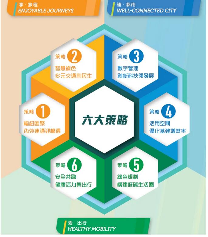 6项策略分别为:枢纽汇聚,内外连通迎机遇;智慧绿色,多元交通利民生;数字管理,创新科技领发展;活用空间,优化基建增效率;绿色规划,构建低碳生活圈;安全共融,健康活力乐出行。