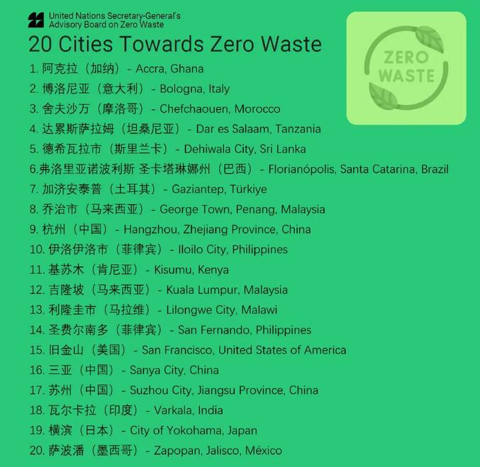 联合国秘书长零废物咨询委员会3月27日发布全球“20个迈向零废物的城市”倡议首批入选名单,肯定入选城市在减少废物、推动循环经济、建设更可持续和包容的城市系统方面所作努力。
